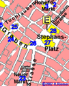 Мы подходим к месту пересечения улиц Kaerntner Strasse (Кэрнтнэр Штрассэ), Graben (Грабэн) и площади Stephansplatz (Штэфансплатц). На углу улицы Graben (Грабэн), слева, находится достопримечательность Stock im Eisen (Шток им Айзэн). Налево, выходим мы на улицу Graben (Грабэн). В середине площади мы видим Pestsaeule (Пэстзойлэ) (24) - мемориальную колонну, воздвинутую как напоминание об эпидемии чумы. Мы идём дальше до переулка Jungferngasse (Юнгфэрнгассэ) и видим справа собор Peterskirche (Пэтэрскирхэ) (25) на площади Petersplatz (Пэтэрсплатц). Мы возвращаемся и идём по улице Graben (Грабэн) дальше, осматривая расположенные на ней магазинчики и кофейные заведения. В самом конце улицы Graben (Грабэн), там, где уже начинается площадь Stephansplatz (Штэфансплатц), находится слева универмаг Haas-Haus (Хаас-Хаус) (26). Находясь на площади Stephansplatz (Штэфансплатц), невозможно не заметить и главный собор Вены - собор Святого Штэфана Staphansdom (Штэфансдом). После обхода собора Святого Штэфана наша пешеходная прогулка заканчивается возле особняка "архиепископа" (эрцбишёфлихэс Палэ) (28). Отсюда мы можем прогуляться по улице Rotenturm Straße (Роттэнтурм Штрассэ) до "шведской" площади Schwedenplatz (Швэдэнплатц) или до канала Дуная Donaukanal (Донауканал). Мы можем также ехать на метро (станция метро Stephansplatz ) на линиях городского метрополитена U1 или U3. Самое лучшее же - просто побродить по улочкам ценра города!